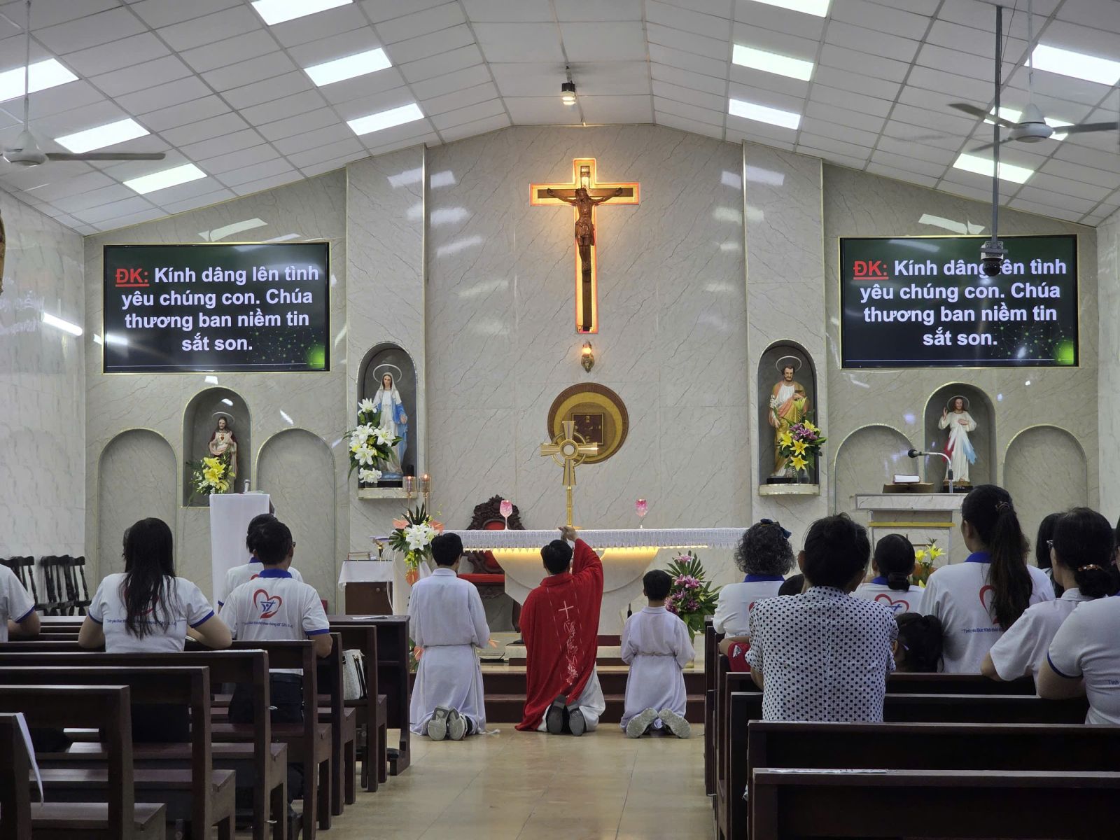 Sau Thánh lễ chiều, cộng đoàn sốt sắng quỳ bên Chúa Giêsu Thánh Thể để dâng lời tạ ơn, chúc tụng và phó thác. Trong bầu khí linh thiêng, mỗi người thinh lặng cầu nguyện, xin Chúa ban ơn nâng đỡ cho hành trình loan báo Tin Mừng giữa đời sống hằng ngày.